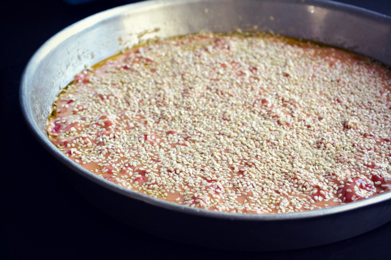 Πασπαλίζουμε με σουσάμι, ραντίζουμε με ελαιόλαδο και φουρνίζουμε.
