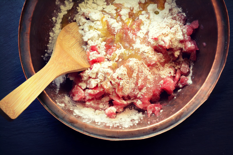 Ανακατεύουμε την ψίχα με το αλεύρι, το ελαιόλαδο, το μέλι, την ζάχαρη και τέλος προσθέτουμε όση κανέλα μας αρέσει, χωρίς όμως να υπερβάλλουμε.